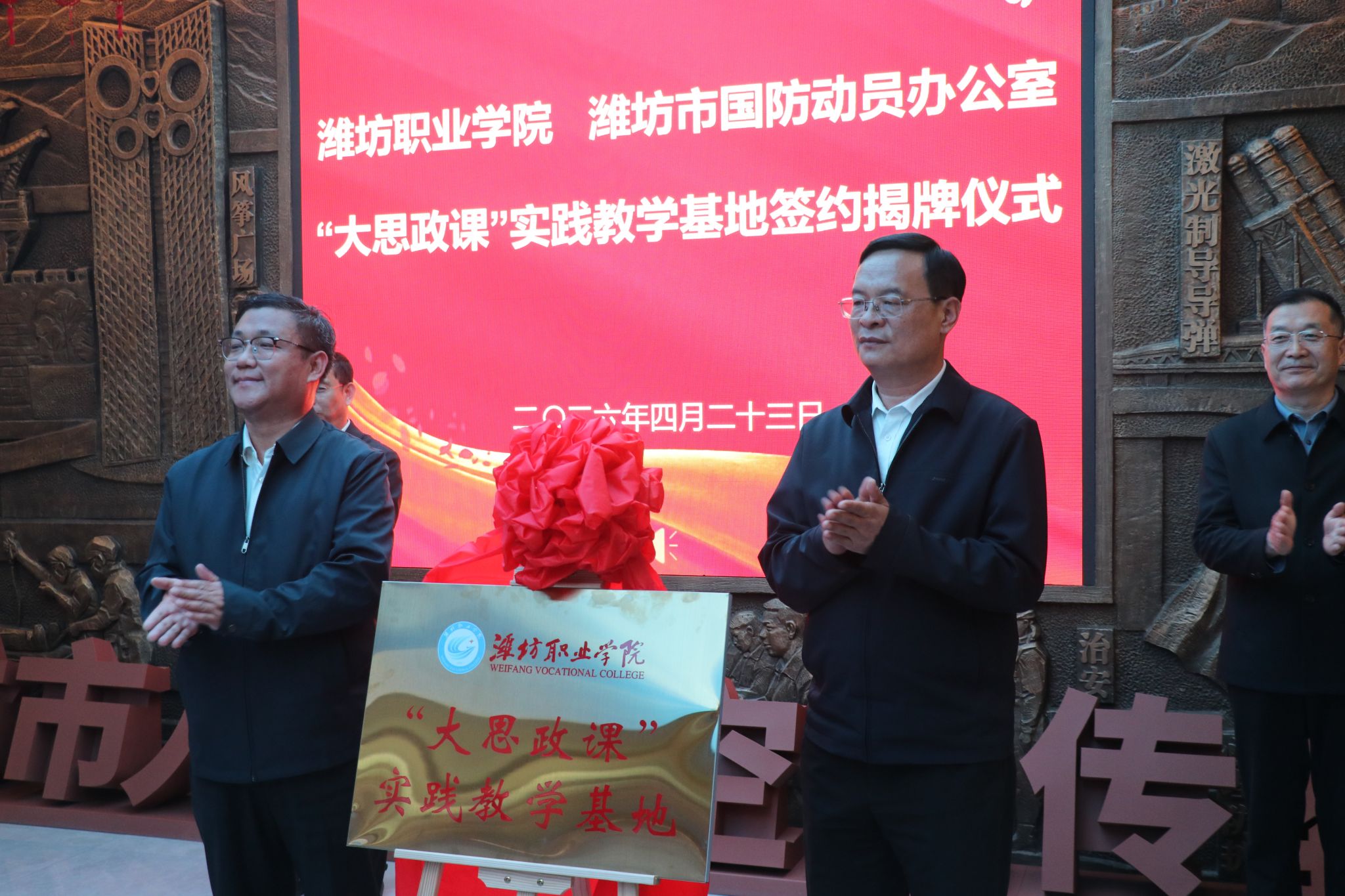 4月23日,潍坊职业学院“大思政课”实践教学基地签约暨揭牌仪式在潍坊市人民防空宣传教育馆举行。学院院长韩瑞东,市国防动员办公室党组书记、常务副主任、市发改委副主任李广懿,学院党委委员、副院长任培华,市国防动员办公室党组成员、四级调研员庞洪泉出席仪式,团委学生工作处、马克思主义学院主要负责同志,第十二期“青年马克思主义者培养工程”培训班学员代表共同参加活动。韩瑞东致辞,对潍坊市国防动员办公室及潍坊市人民防空宣传教育馆的大力支持表示感谢。...更多 -