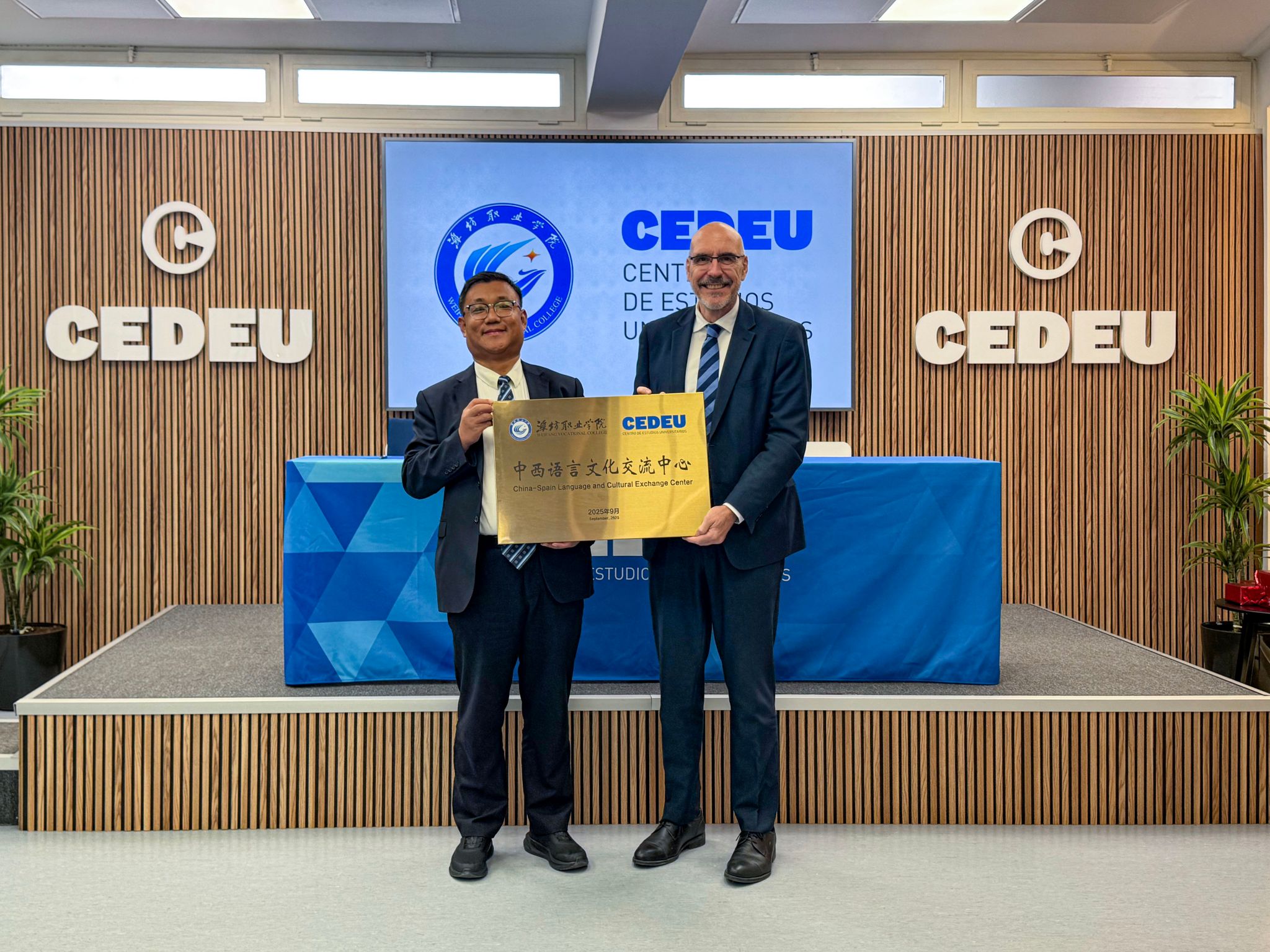 在西班牙期间,代表团访问了巴塞罗那自治大学、ESERP商学院、胡安卡洛斯国王大学CEDEU学院、ENAE商学院及卡塔赫纳理工大学等多所知名教育机构。作为中国职业教育代表,学院访问团受到各院校的热烈欢迎,在巴塞罗那自治大学,语言中心院长帕斯卡尔·肖热情接待了代表团,详细介绍了该校国际教育发展现状与留学招生项目。在胡安卡洛斯国王大学CEDEU学院,院长阿道夫·布隆与韩瑞东共同为“中西语言文化交流中心”揭牌,标志着两校自2024年建立友好关系进入实质性合作新阶段。在ENAE商学院,院长米格尔·莱昂陪同代表团实地考察了办学设施与教学环境。此次出访的重要成果之一,是在西班牙卡塔赫纳理工大学成功举行合作办学机构签约仪式,标志着两校国际化合作迈出关键一步。仪式上,该校校长马蒂厄・凯斯勒・内耶与韩瑞东互赠两校教师创作的艺术作品,以艺术为纽带,深化了两校文化联结与友谊。随后,代表团实地考察了教学设施、实验室及实训中心,重点确认了外方提供的课程大纲与师资资质,为合作办学项目的实施奠定了基础。