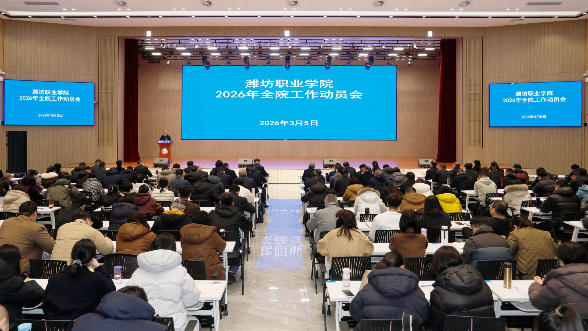 会上,王浩作了题为《锚定目标不放松奋勇争先加油干努力实现“十五五”高质量发展开门红》的讲话,充分肯定了2025年学院在党建引领、双高建设、教学改革、产教融合、国际化办学等方面取得的显著成效,明确了2026年学院总的工作任务和目标定位。他强调,2026年是“十五五”开局之年,全院上下要放眼全国、拓宽视野,对标顶尖高职院校,深化教学关键要素改革,实施教学关键要素改革拔尖工程,构建具有全国影响力的“潍职改革发展品牌”矩阵。王浩要求,全院上下要强化使命担当,凝心聚力推动学院高质量跨越发展:一是坚持党的全面领导,不忘立德树人初心,以政治建设统领学院各项建设;二是坚持正确的政绩观,勇担发展重任,以“升本”倒逼内部治理体系和能力全面升级;三是坚持提升能力,加强理论学习和本领锤炼,跟上本科办学需要;四是坚持理念更新,树牢开放办学、服务发展、人工智能+、合法合规等理念;五是坚持安全第一,坚决兜牢安全稳定底线,确保安全开学。