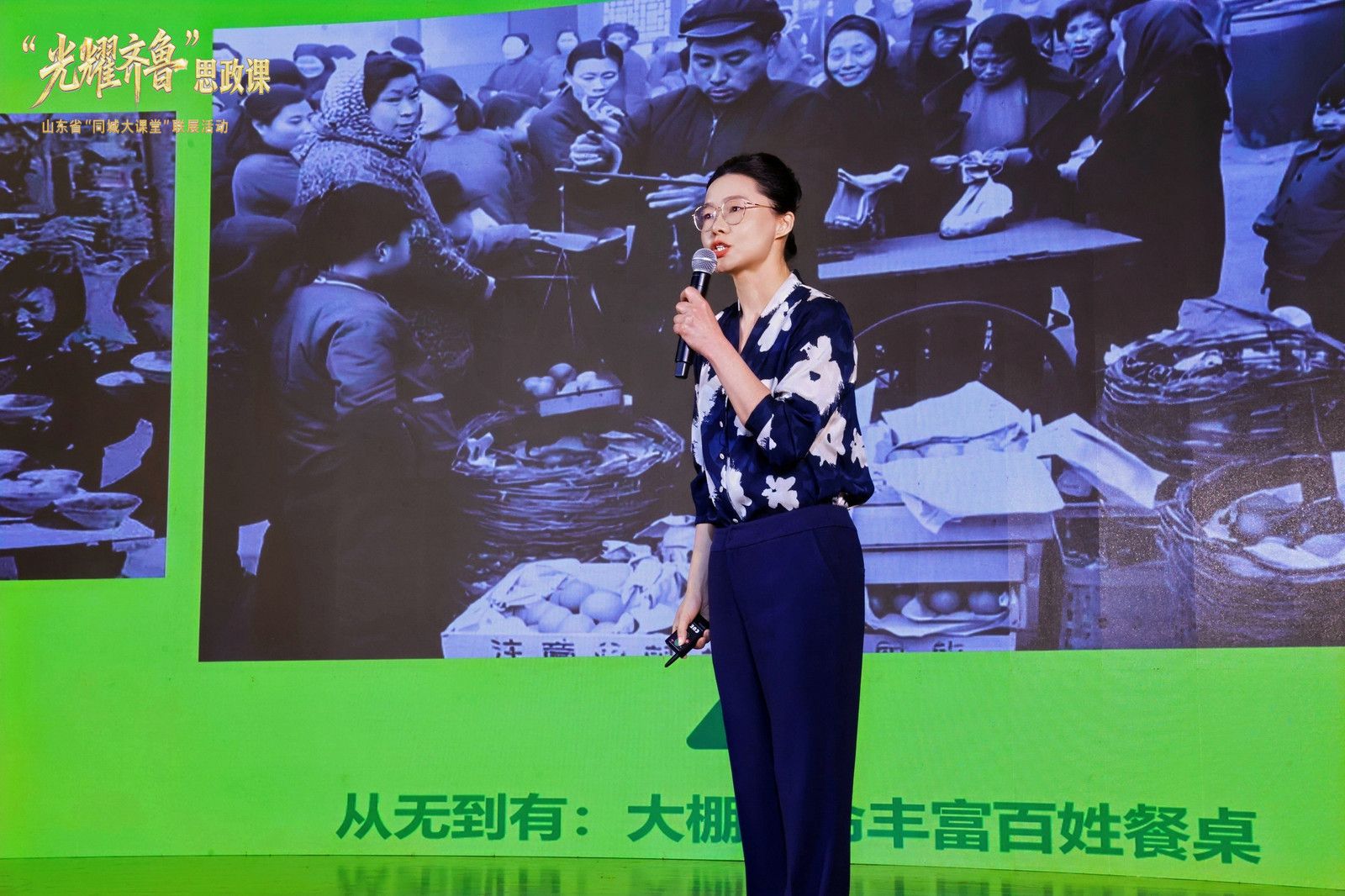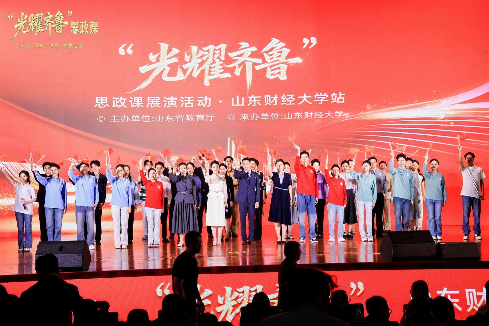 “光耀齐鲁”思政课首场展演由省教育厅主办,山东财经大学承办,是新时代思政课守正创新的山东答卷。活动紧扣“初心”“同心”“民心”三大主题,串联新民主主义革命时期、社会主义革命和建设时期、改革开放和社会主义现代化建设新时期、中国特色社会主义新时代四个历史时期,将山东各时期的革命斗争、发展成就特别是新时代伟大变革成功案例转化为鲜活教材,以艺术化表达、场景化呈现、互动化传播等形式打造沉浸式思政课堂。本次活动安排了《尽瘁铭心》《追光之路》《沂蒙花开》《永怀赤诚》《“蔬”行天下》《河清民安》《齐鲁青未了》等7堂精品思政课,由10所高校的师生独立创作完成,生动诠释了广大师生对党的创新理论的深刻理解与感悟,体现了新时代青年学生在中国式现代化建设中的挺膺担当。我院展演的《“蔬”行天下》作品,介绍了寿光蔬菜从大棚革命、种子革命到科技革命的蔬菜产业化发展历程和伟大成就。