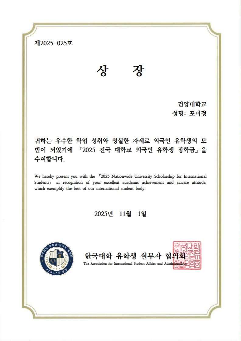 近日,化学工程学院中韩合作办学项目传来捷报:2022级项目学生鲍美婷赴合作院校韩国建阳大学留学期间,因学业成绩突出,斩获韩国大学留学生事务管理协会颁发的“2025全国大学留学生奖学金”。